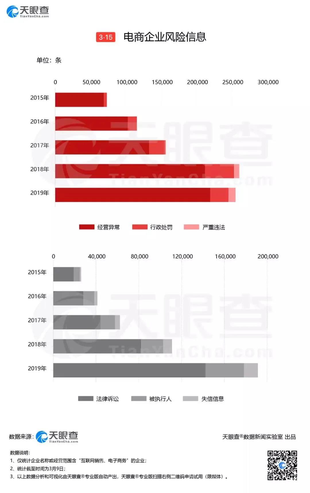 從司法風險來看,法律訴訟案件數量持續(xù)上漲,僅2019年就達14萬件。此外,電商企業(yè)近5年共產生8.6萬條被執(zhí)行人信息和超3萬條失信信息。