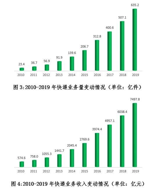 市場規(guī)模中高速增長。2019年,全國快遞企業(yè)日均快件處理量超1.7億件,同比增長25.3%,最高日處理量達5.4億件,同比增長28.5%。全國快遞業(yè)務量突破600億件,累計完成635.2億件,同比增長25.3%,增量規(guī)模連續(xù)兩年超過100億件??爝f業(yè)務收入累計完成7497.8億元,同比增長24.2%,量收增速差從去年的4.8%進一步縮小為1.1%,行業(yè)逐漸由規(guī)模單向驅動向規(guī)模效益雙向驅動轉變。與2010年相比,快遞業(yè)務量收分別增長了26.1倍和12.0倍,業(yè)務收入年均復合增長率是同期國內生產總值增速的4倍,成為拉動經濟增長的重要動力。