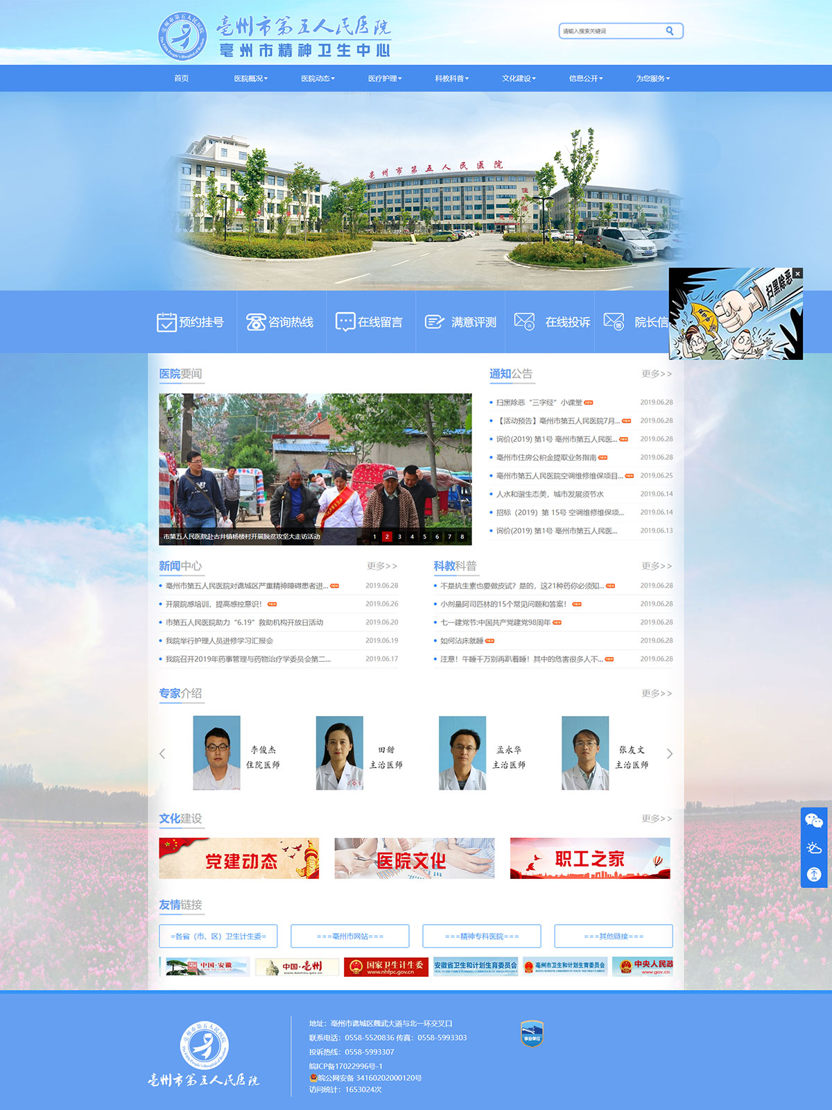 亳州市第五人民醫(yī)院是按照二級(jí)精神??茦?biāo)準(zhǔn)設(shè)置的醫(yī)院,也是全市唯一一家精神??乒⑨t(yī)院。醫(yī)院是2011年中央投資項(xiàng)目,項(xiàng)目總投資5100萬(wàn)元,其中中央投資2700萬(wàn)元,地方配套2400萬(wàn)元,選址位于亳州市譙城區(qū)湯陵街道,北一環(huán)北側(cè)、魏武大道延伸段西側(cè)。占地面積30畝,建筑面積2.4萬(wàn)平方米,設(shè)置床位420張,建設(shè)門(mén)診樓4層、住院樓6層、行政樓4層,2013年5月開(kāi)工建設(shè),2016年5月建成投入使用。